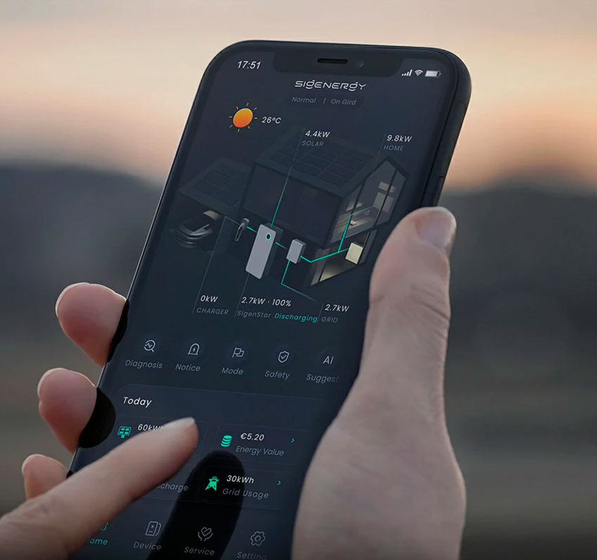 SigenStor aprovecha al máximo cada kilovatio generado. Su gestión inteligente analiza tu consumo y distribuye la energía almacenada para reducir costos y aumentar tu independencia energética.